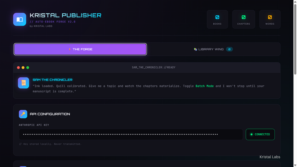 Kristal Publisher is an AI-powered ebook forge. Enter a topic, select your genre, click Generate — and watch chapters materialize in real-time.