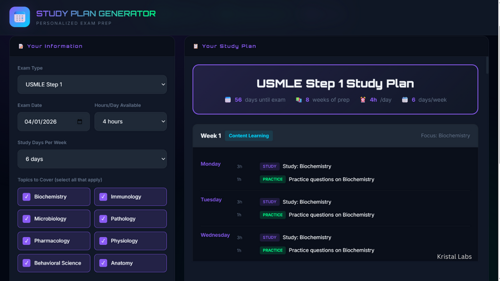 Study Plan Generator | NCLEX, USMLE & MCAT Prep Schedules