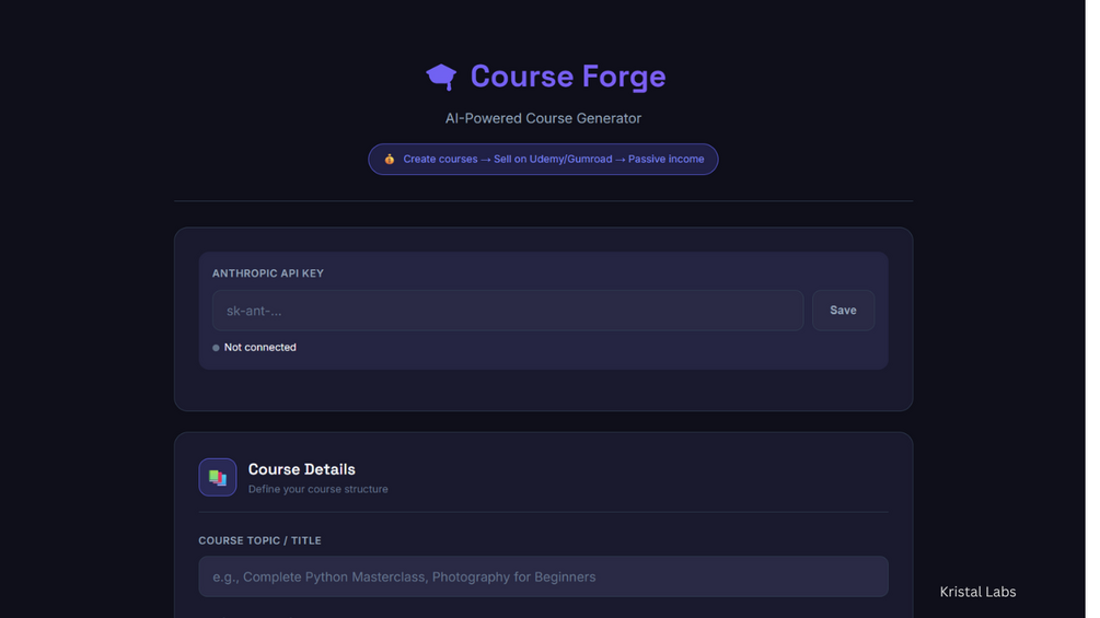 AI-powered course generator. Enter your topic, set your modules and lessons, click generate — get a complete course curriculum with learning objectives, lesson content, and quizzes. BYOK — your API key, unlimited courses forever.