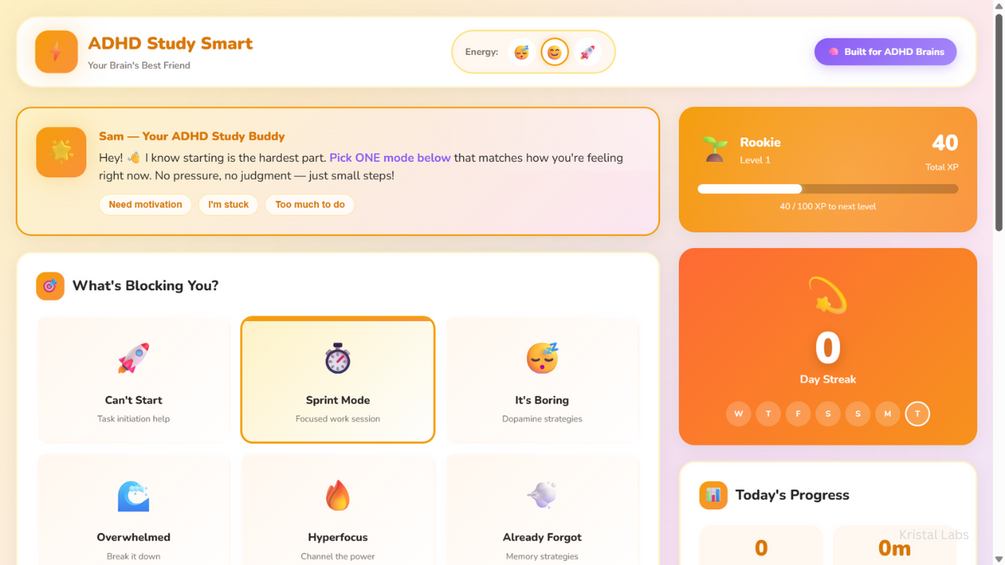 Your ADHD brain's complete study system. Energy modes, body doubling, XP rewards, and a buddy who actually gets it.