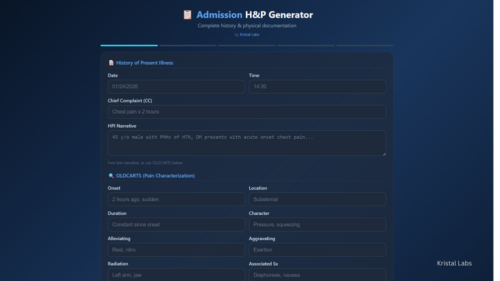 Admission H&P Generator creates clean, formatted history and physical notes — ready to print or copy into your EMR.